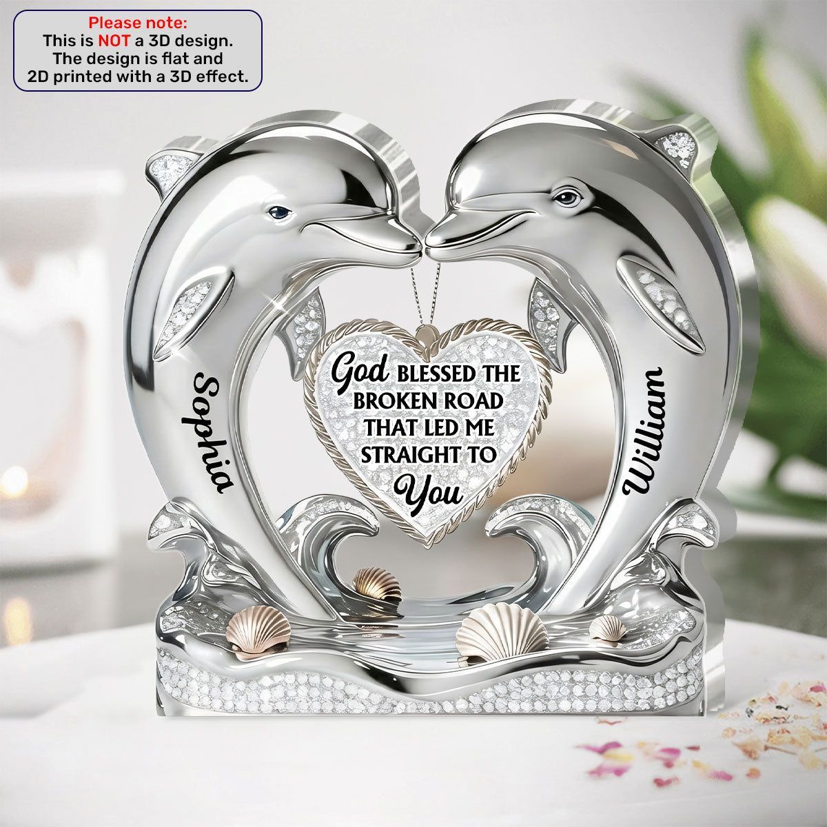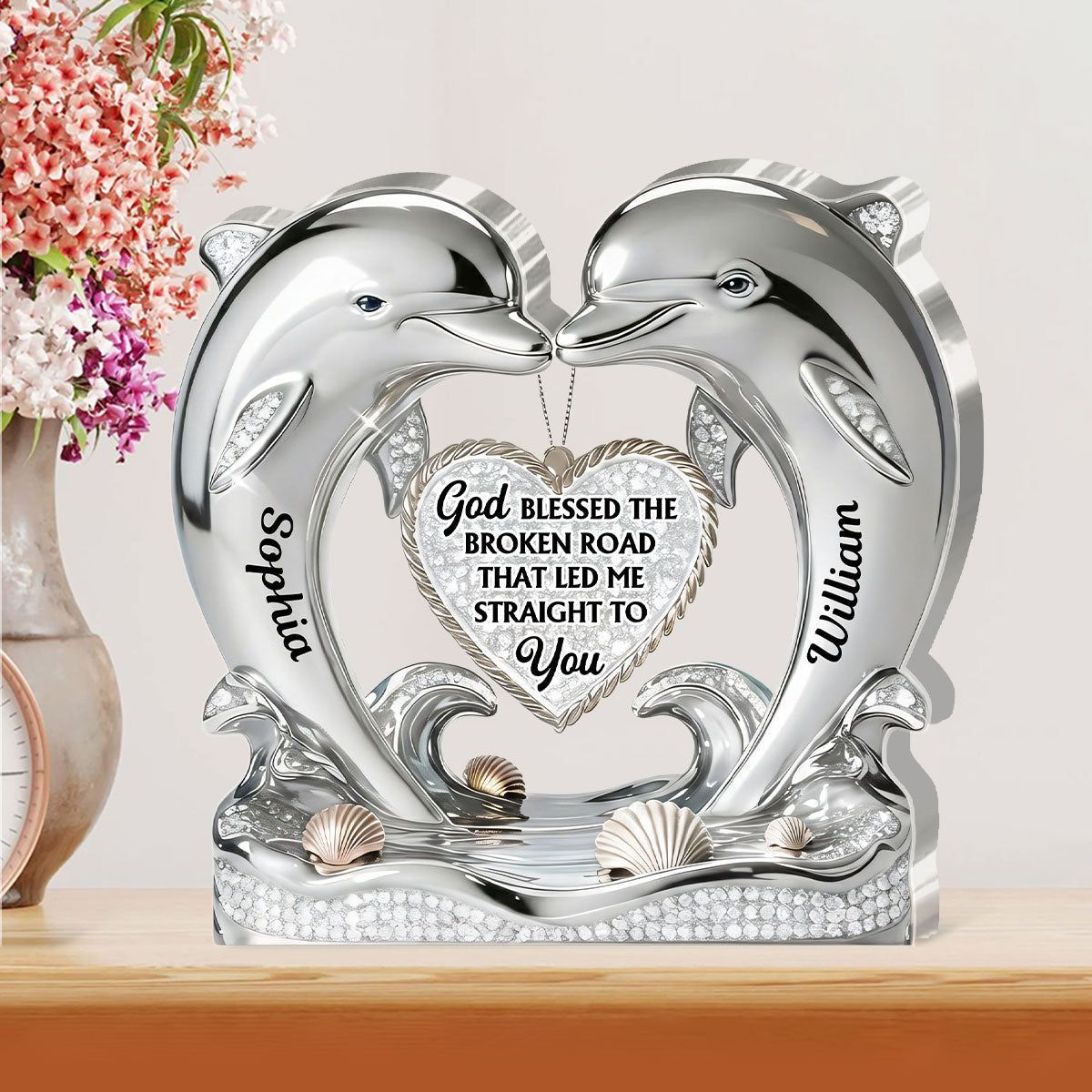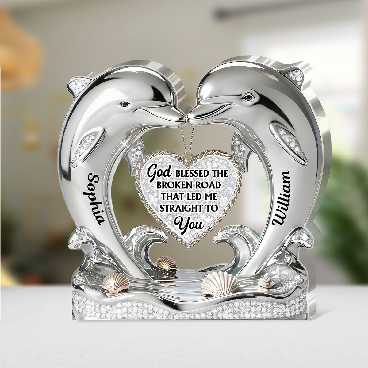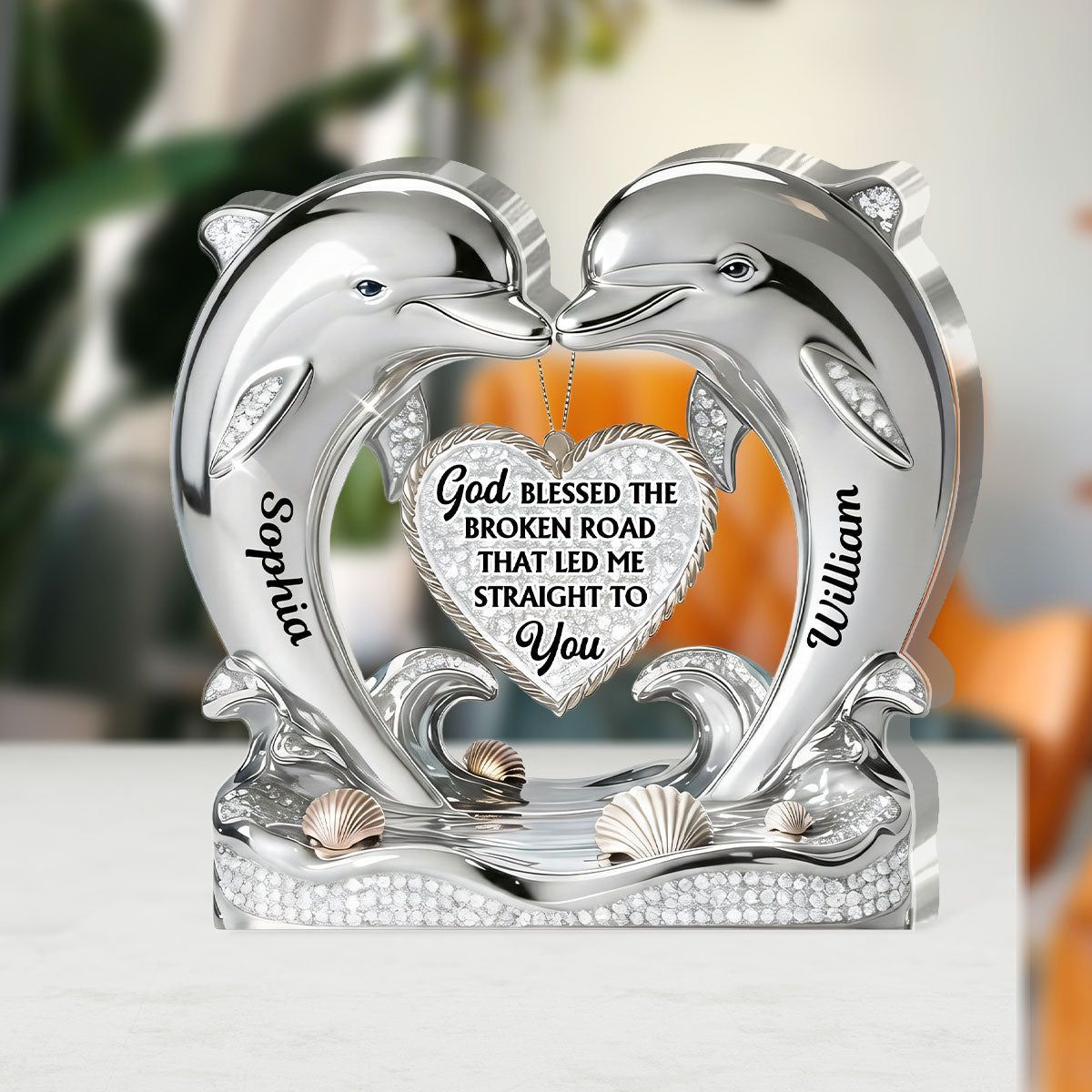 Personalized God Blessed the Broken Road Acrylic Plaque | Custom Name Dolphin Couple Keepsake